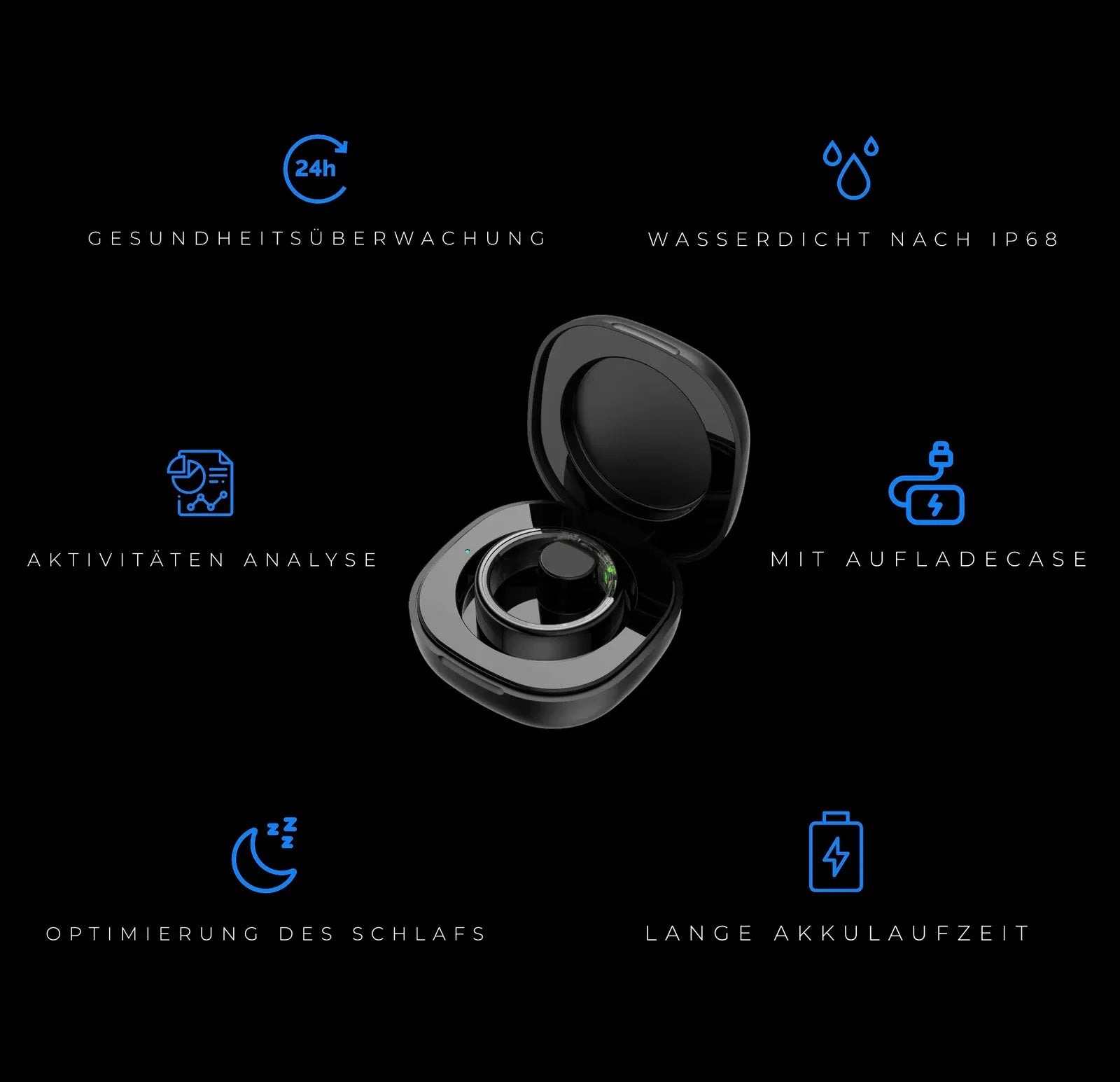 Der Ring wird mit einem praktischen Ladecase geliefert, welches Ihnen ermöglicht, den Ring auch unterwegs zu laden. Für den Ladevorgang legen Sie einfach den Ring in das Case. Das Case selbst wird mit dem mitgelieferten USB-Kabel aufgeladen, was den Ladevorgang einfach und bequem macht.